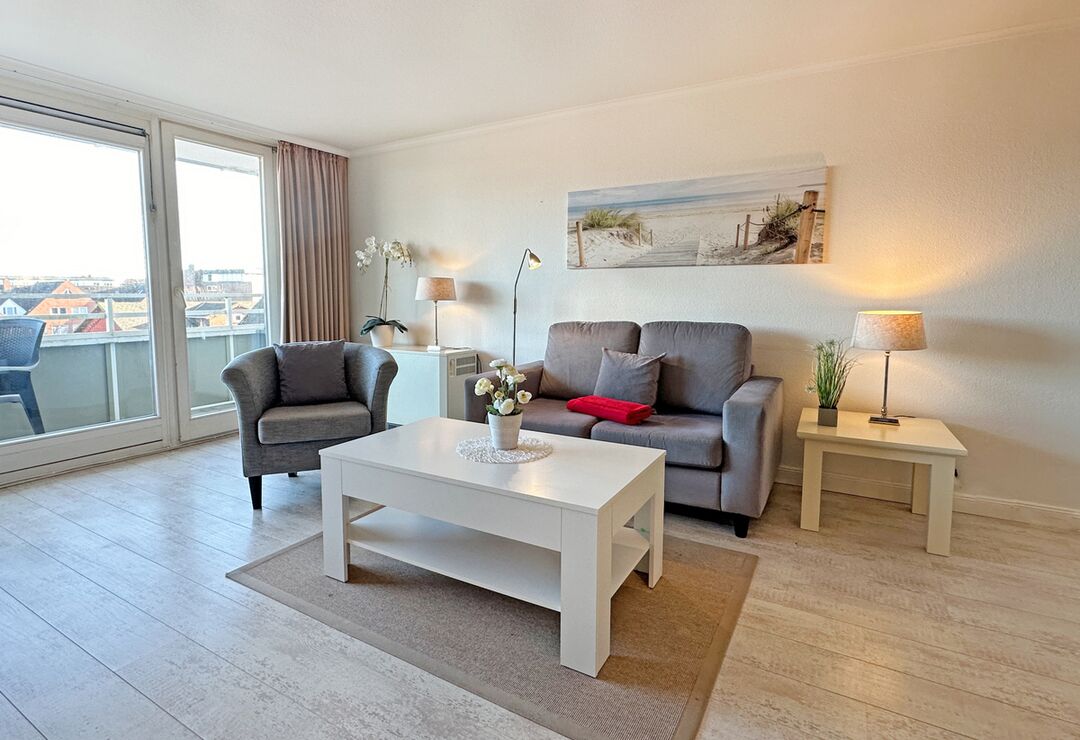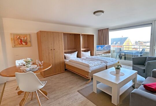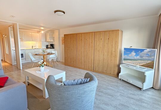 Wohnraum mit Doppelschrankwand mit Einzelbetten (190x85), Kabel-TV, Radio, CD-Player, Telefon mit Flatrate (nur Gespräche ins dt. Festnetz möglich!), Internetzugang. Ostloggia, Tisch/Stühle.