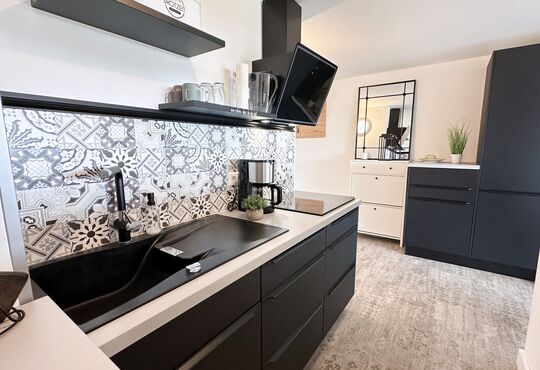 Küche mit Ceranfeld (4 Kochstellen), Mikrowelle, Kaffeemaschine, Wasserkocher, Toaster.