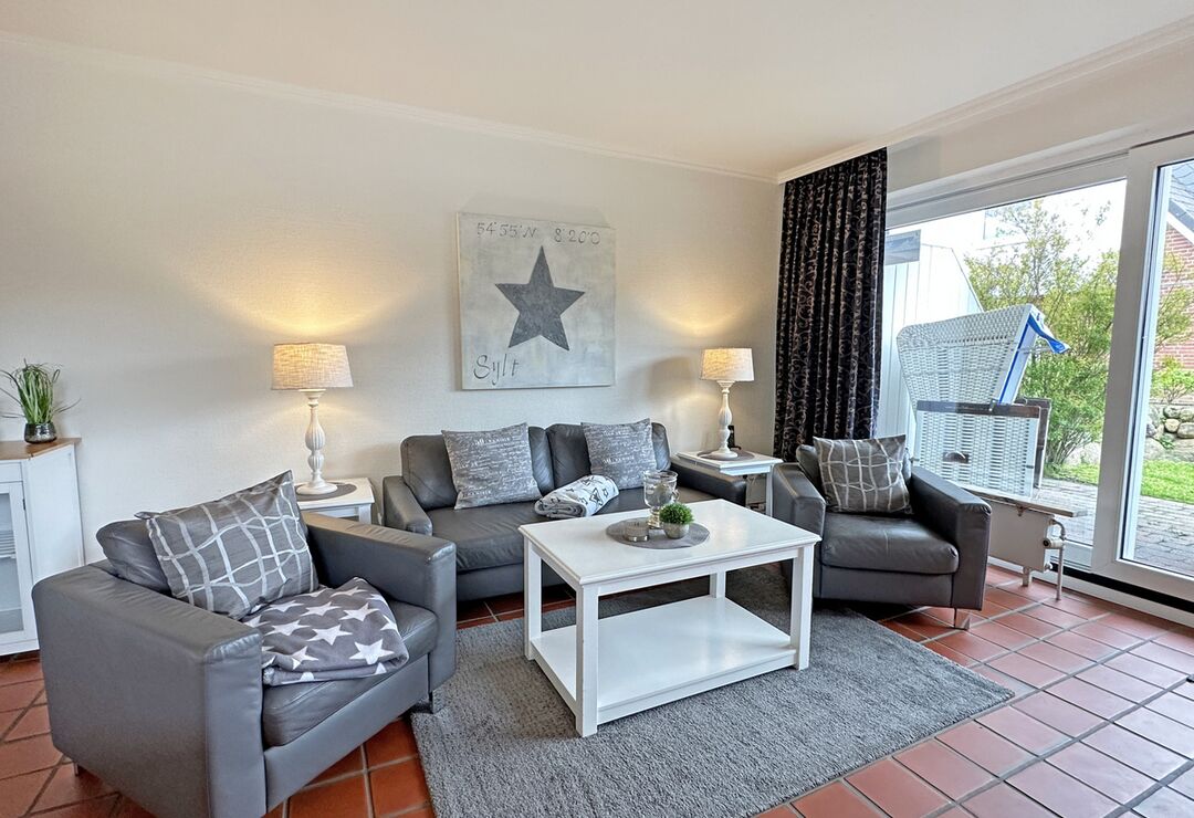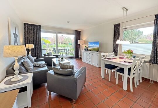 Südterrasse mit Tisch und Stühlen, Strandkorb (April-Oktober).