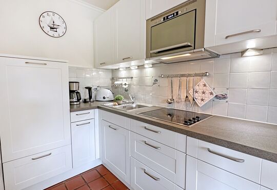 Küchenzeile im Wohnraum mit Ceranfeld (4 Kochstellen), Geschirrspüler, Kombigerät Mikrowelle/Grill, Kaffeemaschine, Wasserkocher, Toaster.