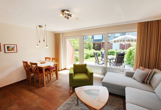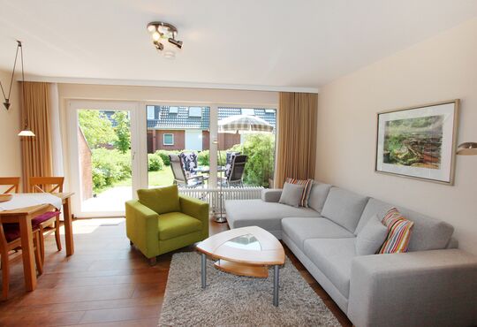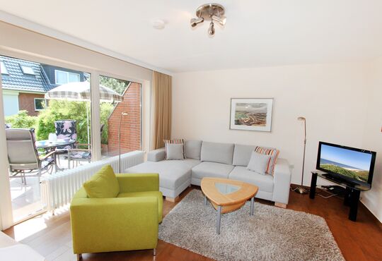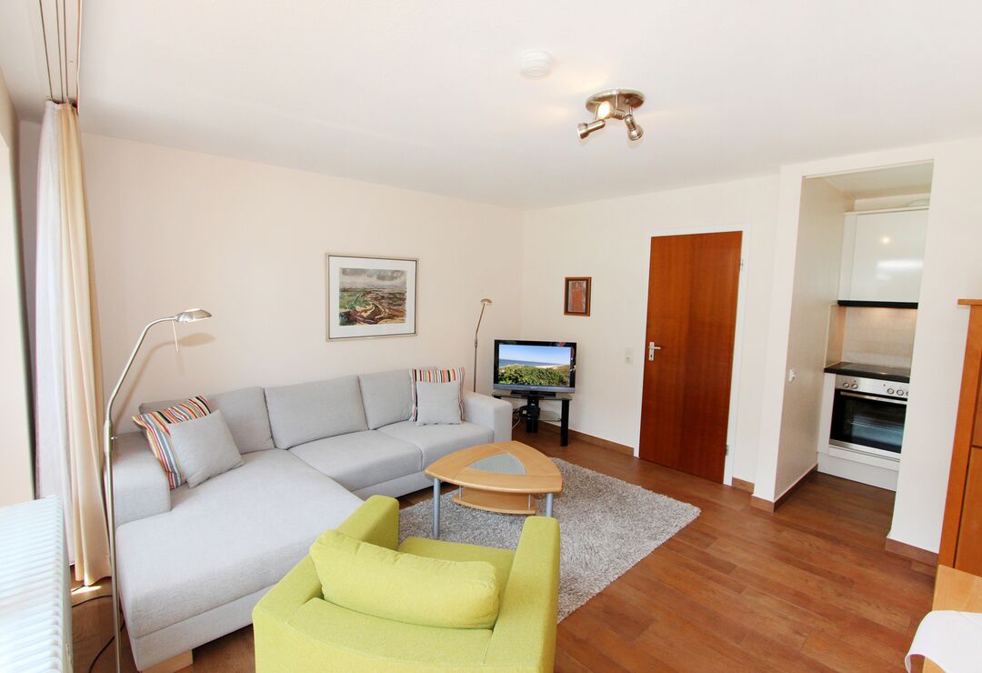 Wohnraum mit Schlafcouch, Kabel-TV, Radio, Telefon mit Flatrate (nur Gespräche ins dt. Festnetz möglich), Internetzugang.