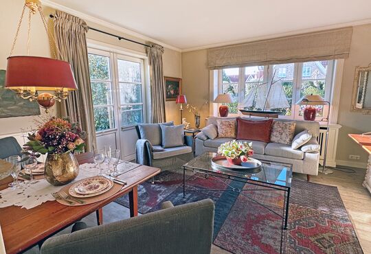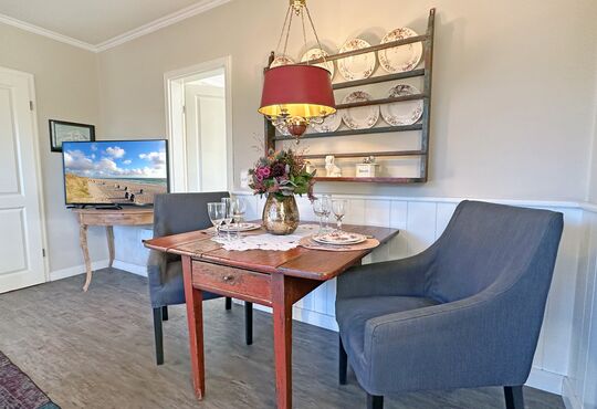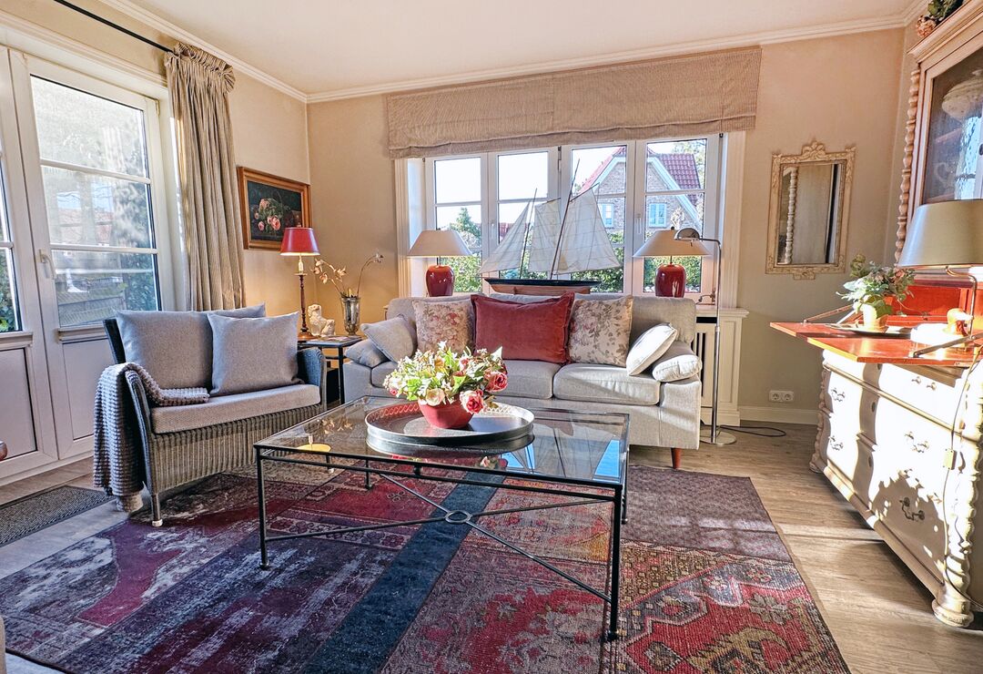 Südterrasse mit Tisch und Stühlen, Strandkorb (April-Oktober).