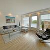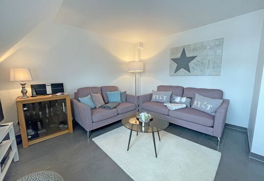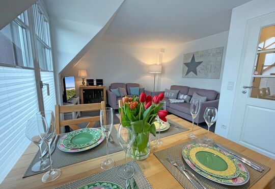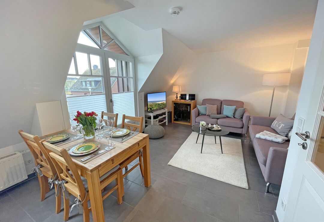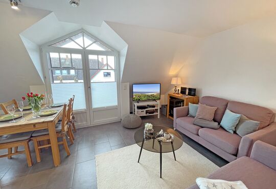Wohnraum mit Kabel-TV, Radio-/CD-Player, Internetzugang. Südbalkon mit Tisch und Stühlen.
