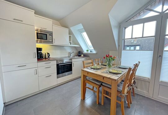Küchenzeile im Wohnraum mit Ceranfeld (4 Kochstellen), Geschirrspüler, Backofen,