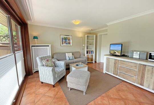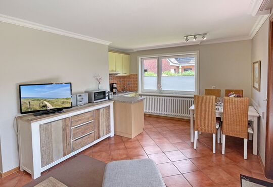 Wohnraum mit Kabel-TV, Radio/CD-Player, DVD-Player, Telefon mit Flatrate (nur Gespräche ins dt. Festnetz möglich!), Internetzugang. Südterrasse mit Tisch und Stühlen, Strandkorb (April bis Oktober).