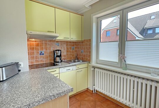 Küchenzeile im Wohnraum mit Ceranfeld (4 Kochstellen), Geschirrspüler, Mikrowelle, Kaffeemaschine, Wasserkocher, Toaster.