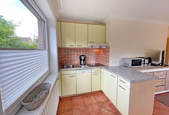 Küchenzeile im Wohnraum mit Ceranfeld (4 Kochstellen), Geschirrspüler, Mikrowelle, Kaffeemaschine, Wasserkocher, Toaster.