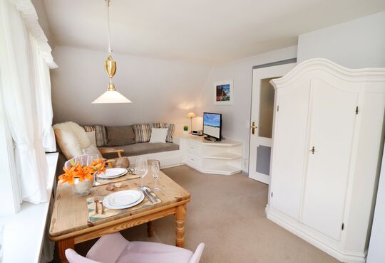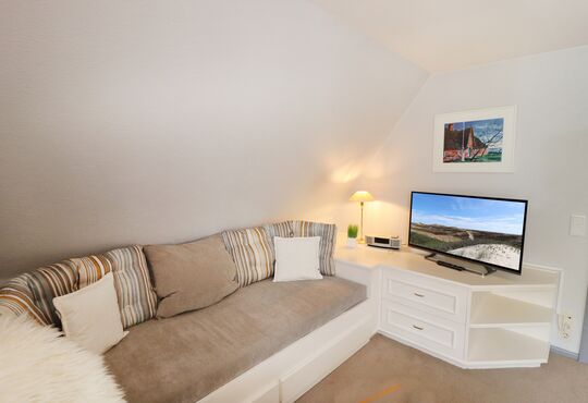Wohnraum mit Schlafcouch für eine Person, Kabel-TV, Radio, Telefon mit Flatrate (nur Gespräche ins dt. Festnetz möglich!), Internetzugang.