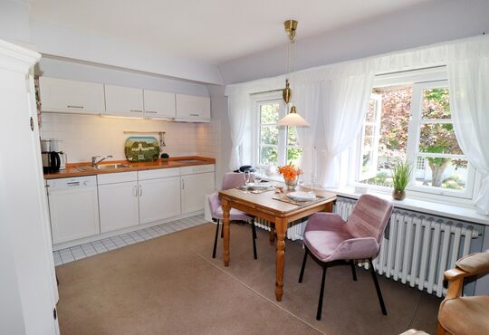 Küchenzeile im Wohnraum mit Ceranfeld (4 Kochstellen), Mikrowelle/Grill, Geschirrspüler,