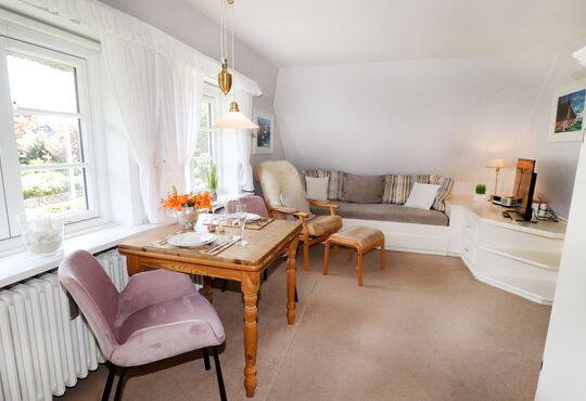 Gem. Sitzgruppe im Garten mit Strandkorb (April-Oktober).