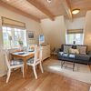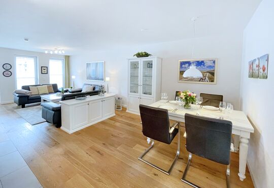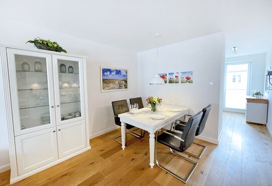 Ausgang zum westseitig gelegenen Balkon mit Tisch und Stühlen. Strandkorb (April-Oktober).