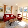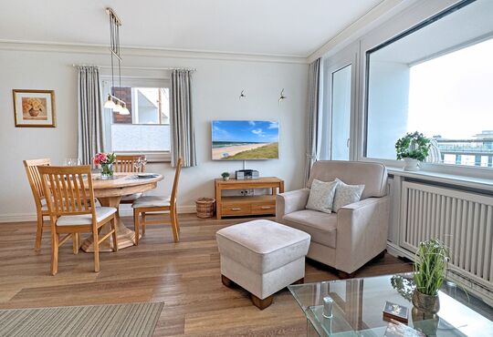 Wohnraum mit Kabel-TV, Internetzugang. Ausgang zum süd-westseitig gelegenen Balkon mit Tisch und Stühlen und kleinem Meerblick.