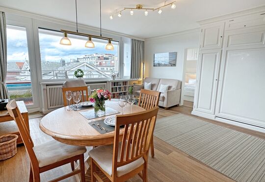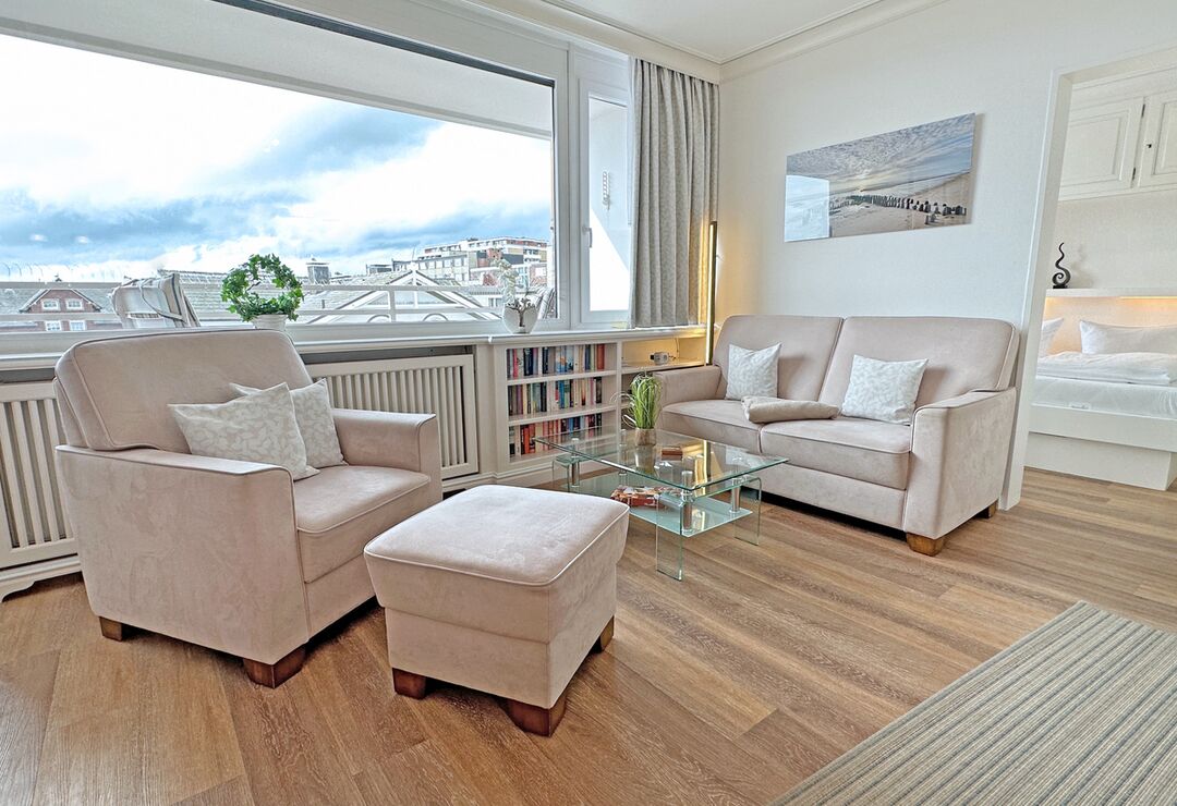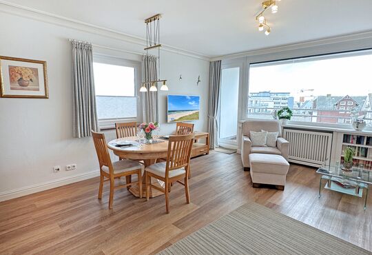 Die Ferienwohnung befindet sich in der 4. Etage eines Appartementhauses (Haus Strandstraße 22) direkt im Zentrum Westerlands, nahe der Kurpromenade.