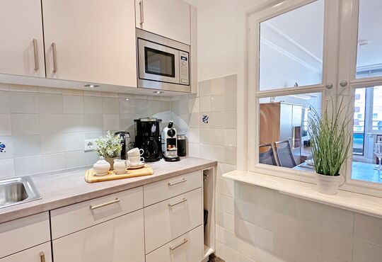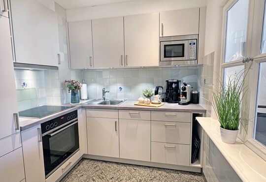 Einbauküche mit Ceranfeld (4 Kochstellen), Geschirrspüler, Backofen/Mikrowelle, Kaffeemaschine, Wasserkocher, Toaster, Nespressomaschine.