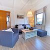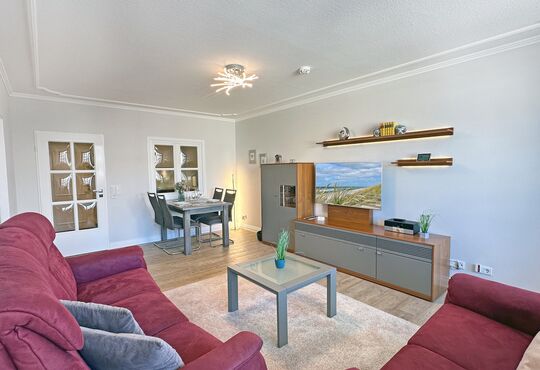 Wohnraum mit Kabel-TV, Internetzugang. Ausgang zum westseitig gelegenen Balkon mit Tisch und Stühlen.