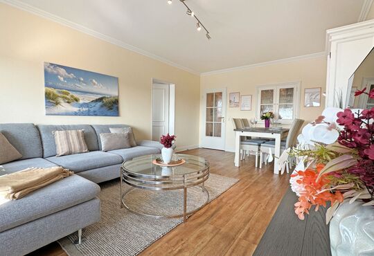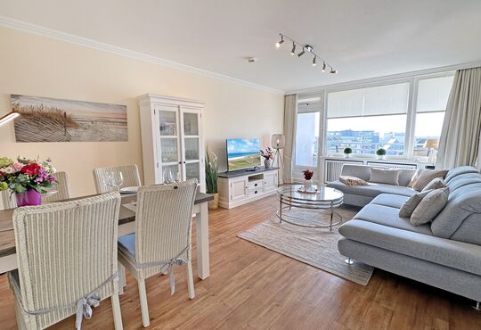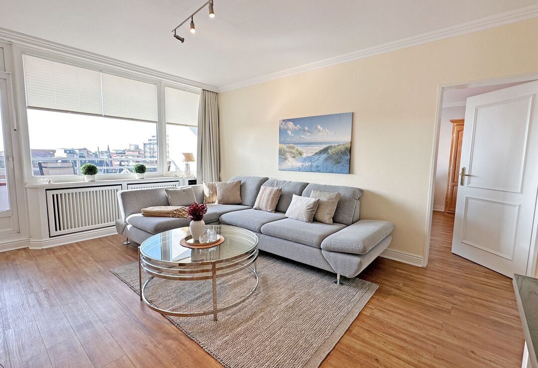 Die Ferienwohnung befindet sich in der 5. Etage eines Appartementhauses (Haus Strandstraße 22) direkt im Zentrum Westerlands, nahe der Kurpromenade.