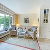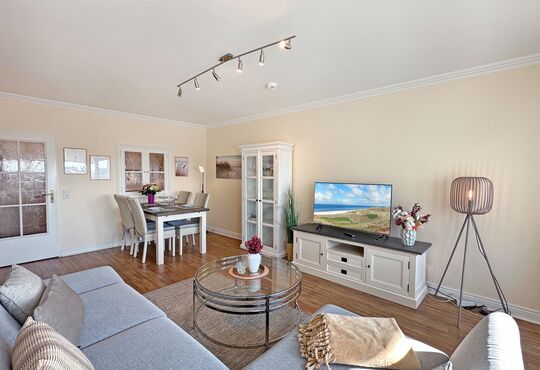 Wohnraum mit Kabel-TV, Internetzugang. Ausgang zum süd-westseitig gelegenen Balkon mit Tisch und Stühlen.
