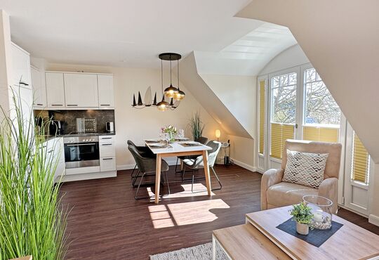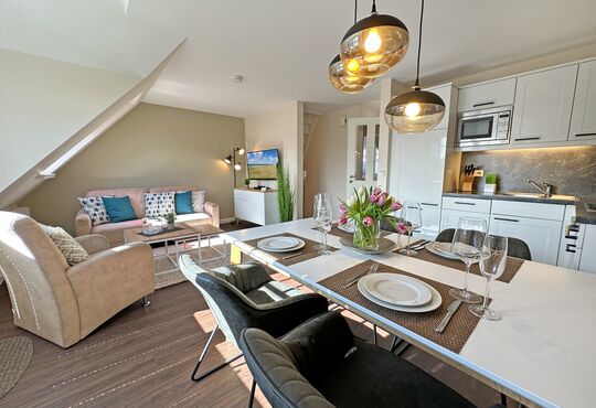 Küchenzeile im Wohnraum mit Ceranfeld (4 Kochstellen), Geschirrspüler, Backofen, Mikrowelle, Kaffeemaschine, Nespressomaschine, Wasserkocher, Toaster.