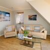 Wohnraum mit Ecksofa, Kabel-TV, Internetzugang, Ausgang zur Südterrasse mit Tisch und Stühlen.