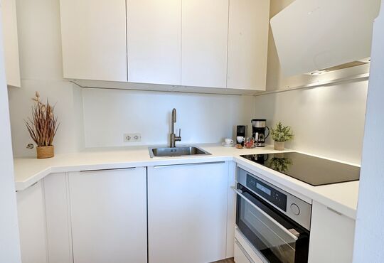 Küchenzeile im Wohnraum mit Ceranfeld (4 Kochstellen), Backofen, Geschirrspüler, Kaffeemaschine, Wasserkocher, Toaster, Nespressomaschine.