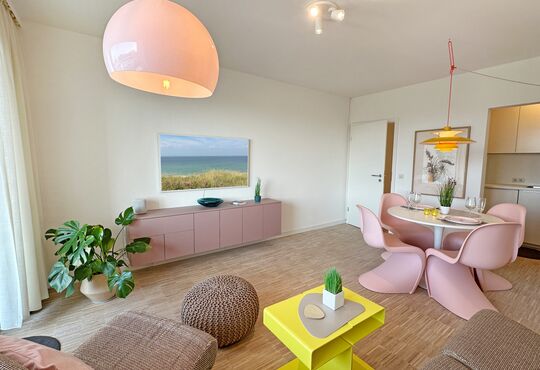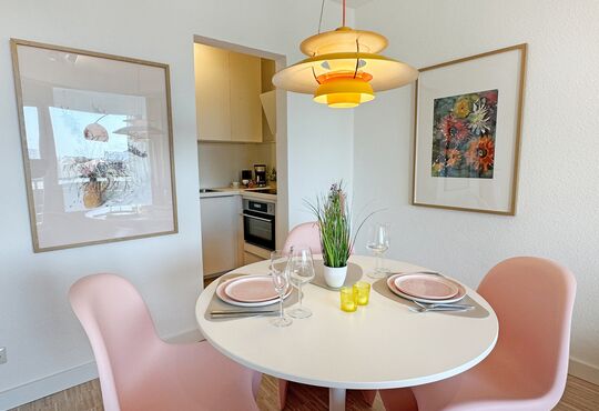 Wohnraum mit Kabel-TV, Apple-Sound-Box, Internetzugang. Westbalkon mit Tisch und Stühlen.