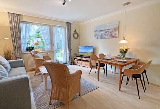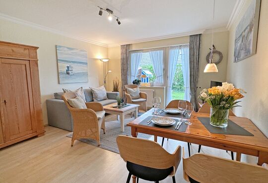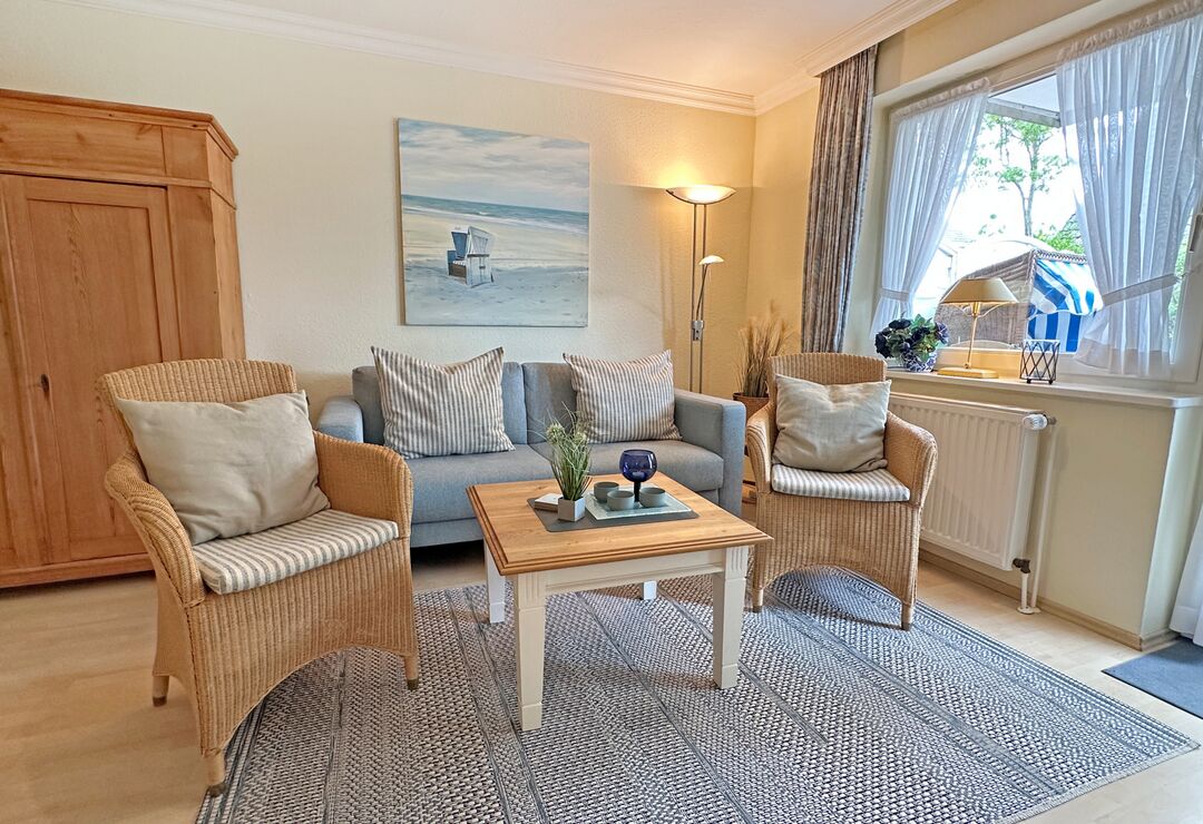 Südterrasse mit Tisch und Stühlen, Strandkorb (April-Oktober).