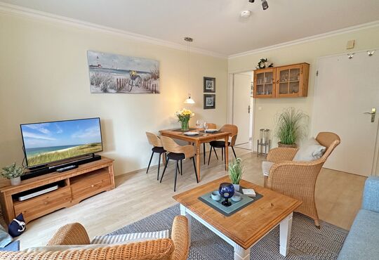 Wohnraum mit Kabel-TV, Radio, Telefon mit Flatrate (nur Gespräche ins dt. Festnetz möglich!), Internetzugang.