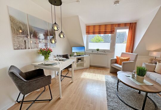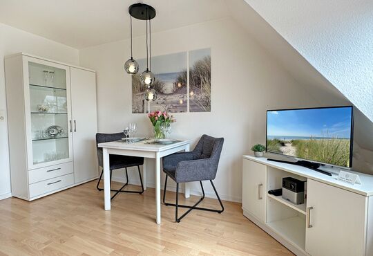 Wohnraum mit Schlafcouch, Kabel-TV, Radio-/CD-Player, Telefon mit Flatrate (nur Gespräche ins. dt. Festnetz möglich!), Internetzugang.