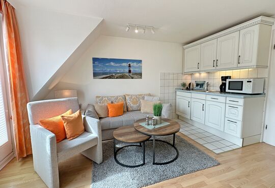 Küchenzeile im Wohnraum mit Ceranfeld (2 Kochstellen), Geschirrspüler, Mikrowelle, Kaffeemaschine, Wasserkocher, Toaster.